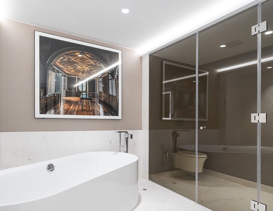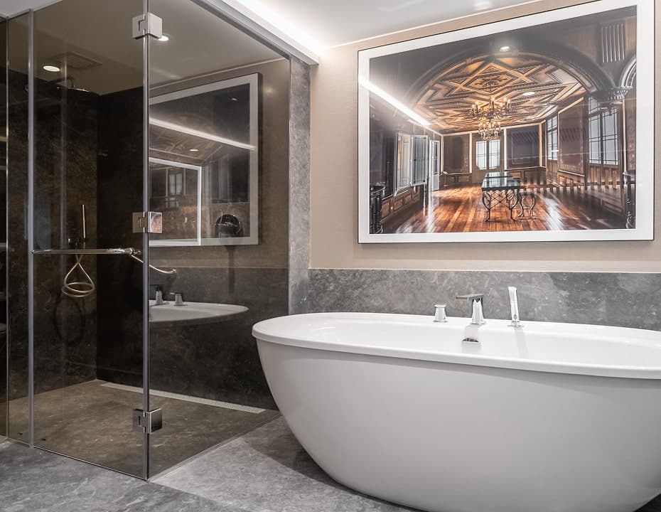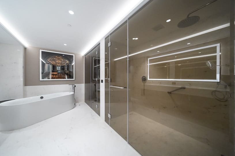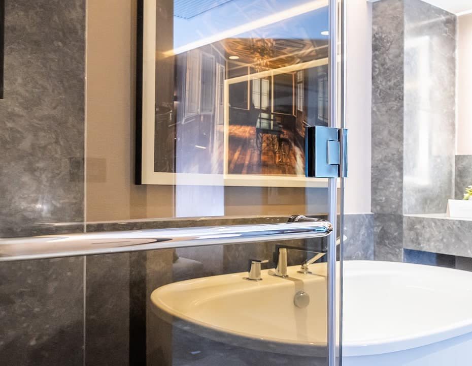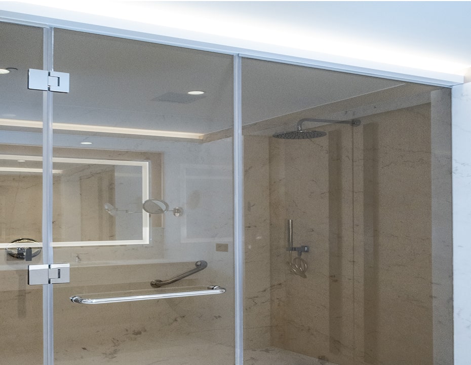 Proyecto hotelero con puertas de ducha batientes y fijas en vidrio templado, perfiles de acero inoxidable brillante. Soluciones duraderas y elegantes que combinan funcionalidad y diseño moderno.